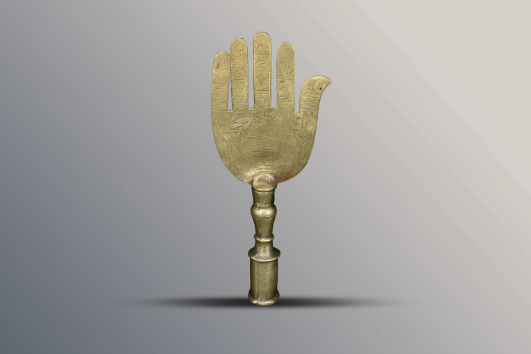 تزن القطعة حوالي ( 503 ) غرام و يظهر على الكف نقوشاً فنية متنوعة تشمل الزخارف الهندسية والنباتية والحيوانية، مع النقوش الكتابية التي تحمل لفظ الجلالة ( الله ) و أسماء أصحاب الكساء ( محمد ، علي ، فاطمة ، الحسن ، الحسين عليهم السلام ) إضافة إلى عبارات مثل " يا حسين - يا إمام - يا مظلوم " .