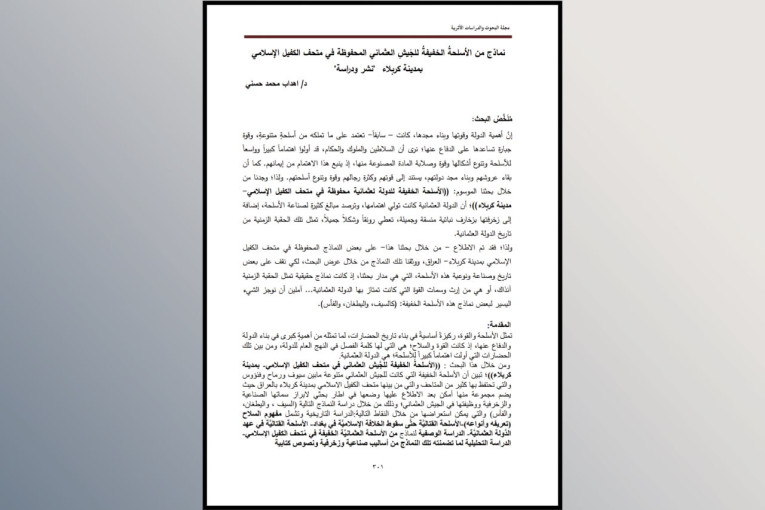 وتمثّلت الدراسة ببحثٍ أكاديميّ منشور في مجلّة البحوث والدراسات الأثرية، بعنوان (نماذج من الأسلحة الخفيفة للجيش العثماني المحفوظة في متحف الكفيل الإسلامي بمدينة كربلاء)، أعدّته التدريسيّة في كلّية الآثار بجامعة أسوان المصرية الدكتورة أهداب محمد حسني.
