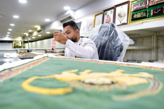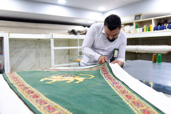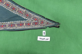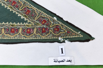وتولت الأعمال وحدة السجاد التابعة لشعبة المخزن إحدى تشكيلات المتحف، ويتصف العلم بشكل مثلّث وبلون أخضر، يحيط به شريط من الزخارف النباتية الدقيقة مصنوع من قماش الكتّان المحاك يدويًّا.