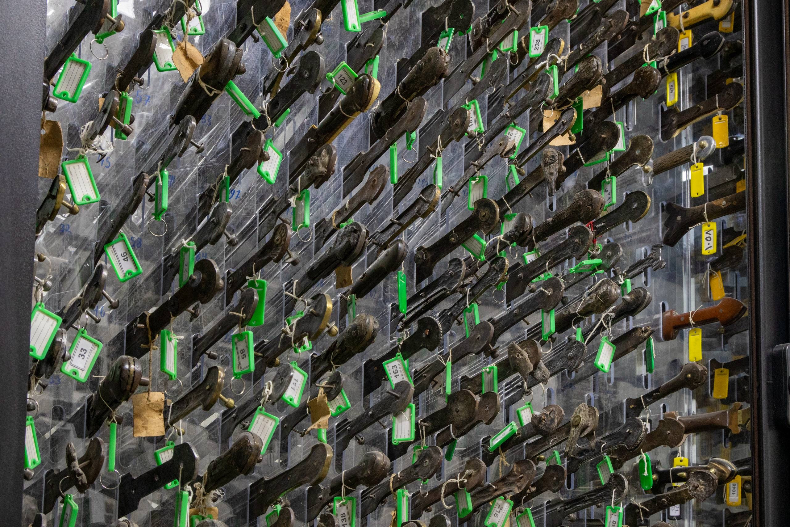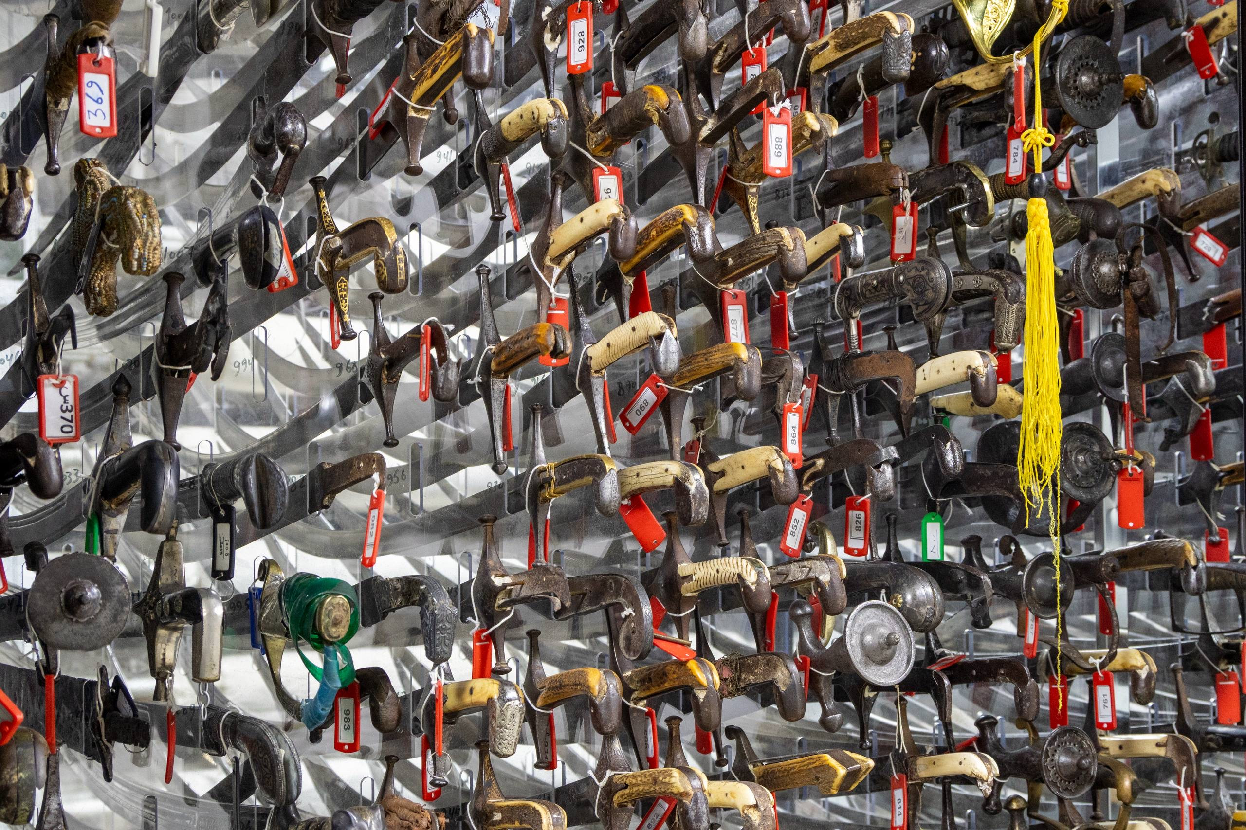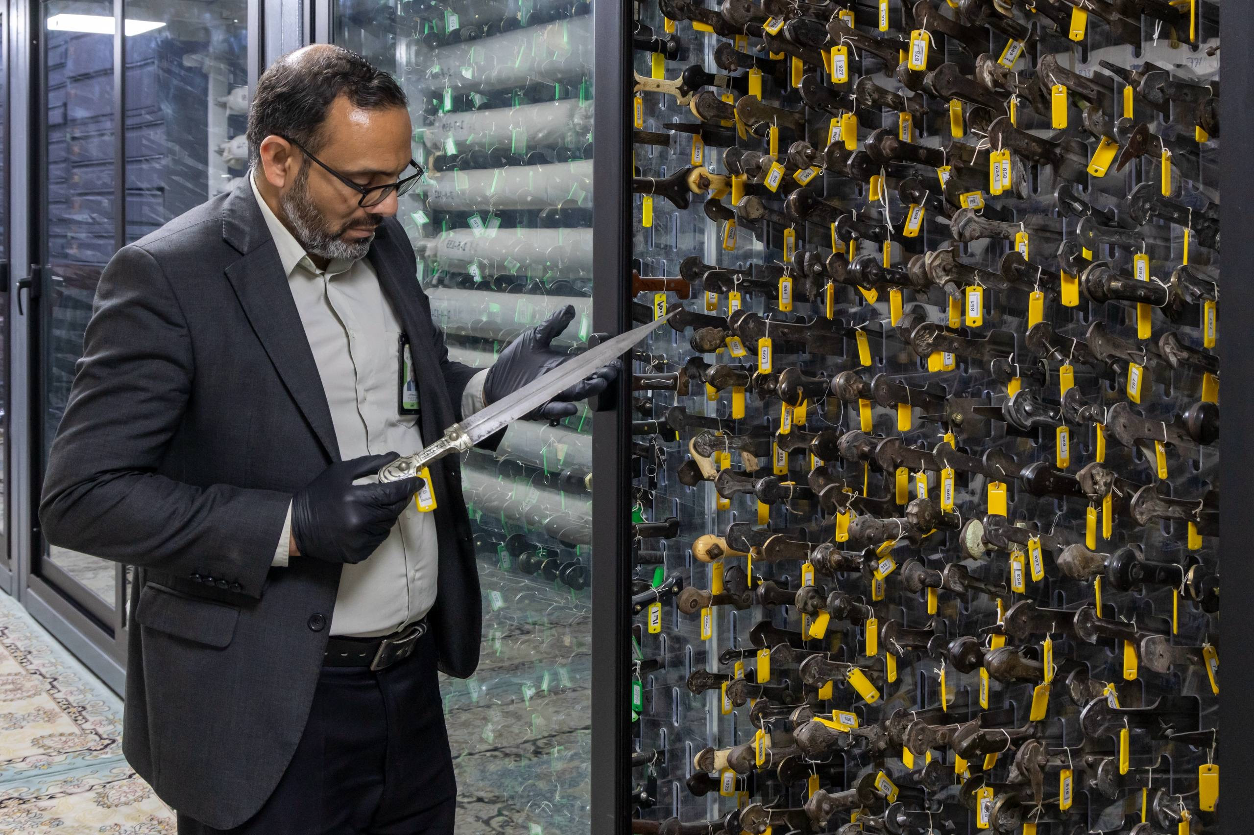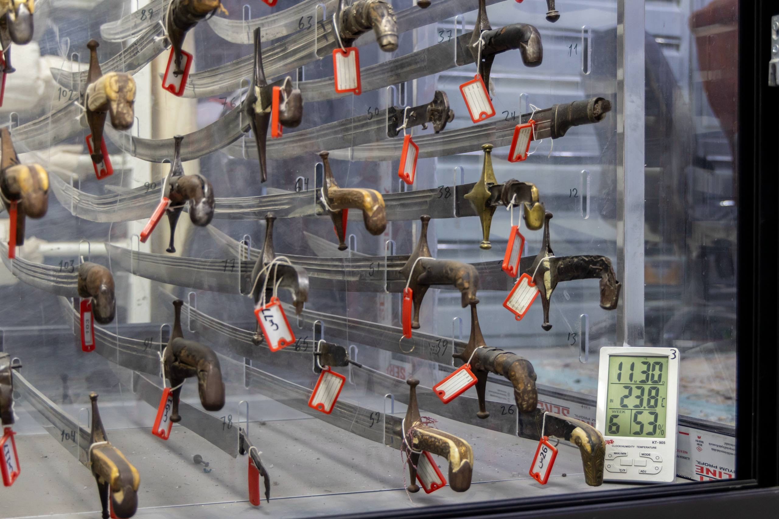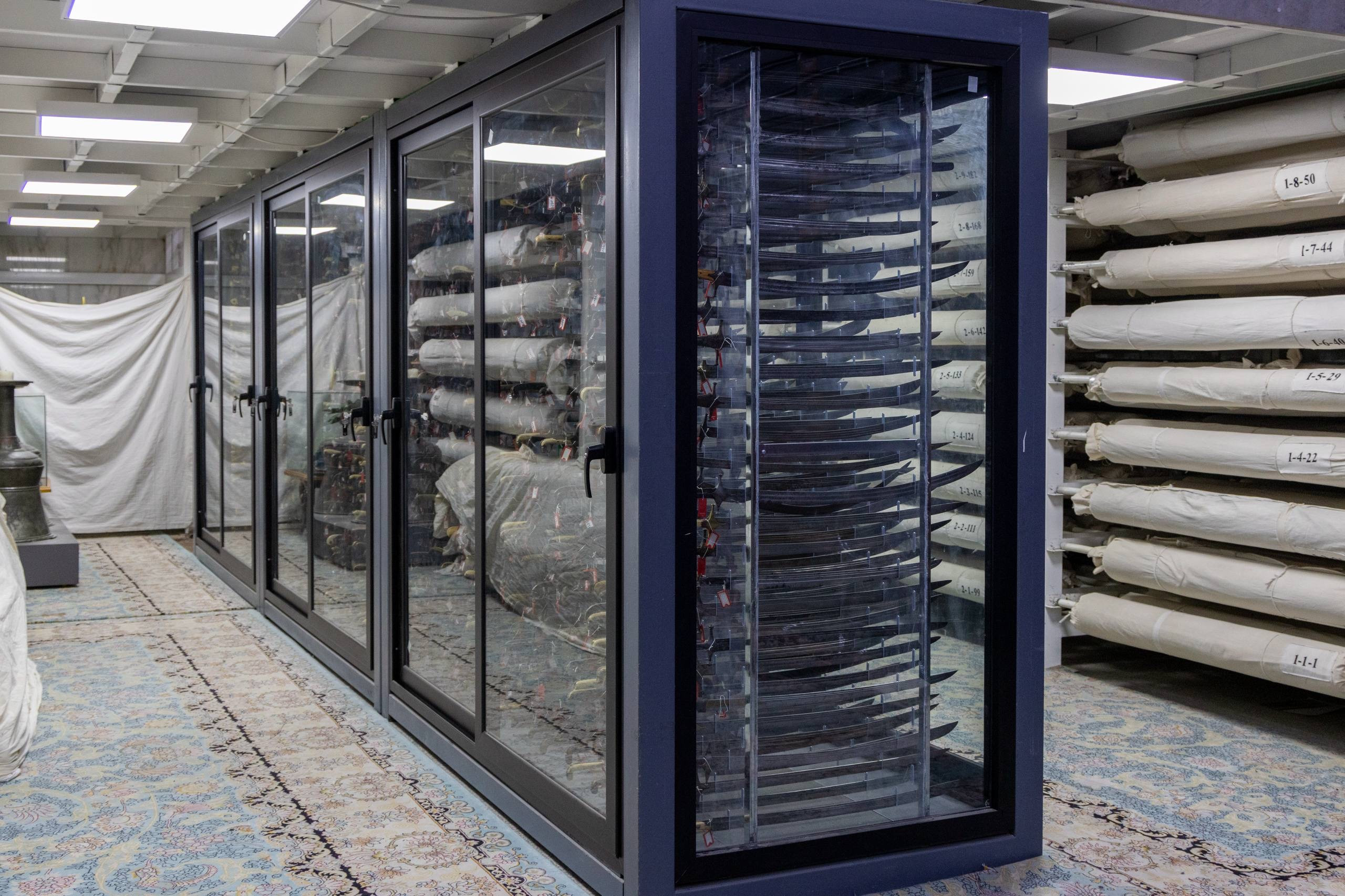 وينتهج المتحف نظاماً متقدماً في خزن أكثر من 3 آلاف قطعة متنوعة من الأسلحة البيضاء، إذ صُمِّمت العارضات بطريقة دقيقة تتيح إدخال نصل القطعة بشكل آمن وثابت، بما يضمن الحفاظ عليها من أي ضرر محتمل، ويمنع حركتها أو احتكاكها ببقية النفائس.