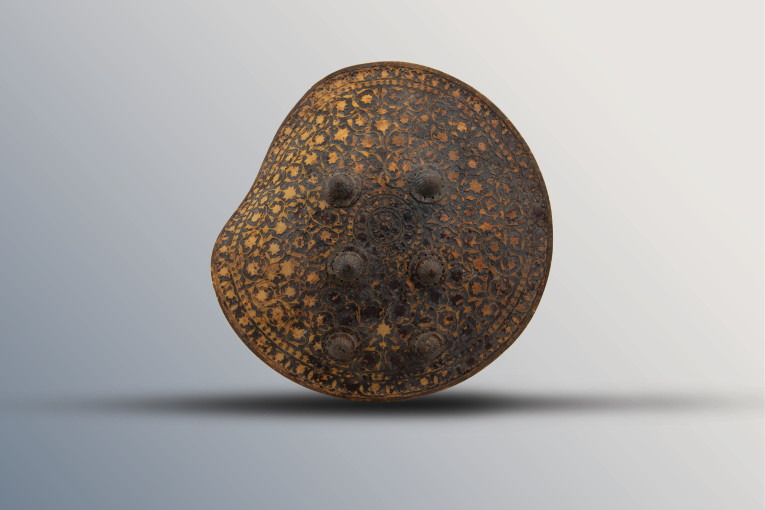 وبيّن أنّ "الدرع مصنوع من جلد وحيد القرن، وهو متضرر جزئيًّا، ويتخذ شكلًا دائريًّا بقطر يبلغ 44 سم، ووزن يصل إلى 2035 غرامًا، ويتميز بلونه البني المزيّن بنقوش نباتية سوداء، وتوجد على سطحه الخارجي ست قبب بارزة تؤدي وظيفة امتصاص وتقليل تأثير ضربات السيوف والنبال، فيما يحتوي من الداخل على وسادة جلدية مستطيلة محشوة بالقطن، تتصل بست حلقات حديدية مرتبطة بحزام جلدي يُستخدم لحمله".