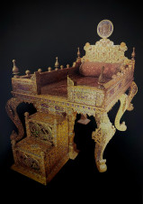 أما قصة العرش الموجود و المحاك في مركز السجادة ، فهو عرش الطاووس التابع لسلطنة المغول الهندية الذي إستولى عليه نادر شاه و أخذه الى ايران ليصبح عرش الطاووس رمزاً للحكام الفرس ، ويعد إسم العرش مشتق من شكله الذي يشبه الطاووس و هو مرصع بالياقوت الأحمر و الأزرق و الزمرد و اللؤلؤ و مختلف الأحجار الكريمة الأخرى ، و يصف الجواهرجي الفرنسي تافرنييه و الذي زار دلهي عام 1665 م عرش الطاووس بأنه على شكل سرير مرصع بالأحجار الكريمة النادرة و المسنود على الأرض بأرجل قوية ، و بعد قتل نادر شاه عام 1747 م ، تم تدمير العرش ، إلا أن عروش إيران اللاحقة أصبح يشار اليها بعرش الطاووس ، كالعرش النادري الذي صنع عام 1812 م للإمبراطور فتح علي شاه قجار و العرش الآخر لمحمد شاه قاجار والذي صنع عام 1836 م وصولاً الى شاه إيران الأخير محمد رضا بهلوي والذي يحفظ حالياً في الخزانة الخاصة للمجوهرات الوطنية التابعة للبنك المركزي الإيراني .