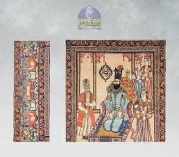 زينت السجادة بنقوش نباتية و حيوانية تحيط بمركزها الذي يحمل رسماً بالخيوط لعرش الطاووس الخاص بالملك الأفشاري و مؤسس الدولة الأفشارية نادر شاه و هو جالس على العرش ماسكاً بسيف سلطانه كتب على يمينه داخل طرّة محاطة بزخرفة رائعة ( نادر شاه أفشار ) و يظهر في اللوحة وزرائه و حاشيته و هم يحيطون به ، و أمامه منضدة وضع عليها أكليل من الزهور .