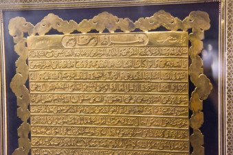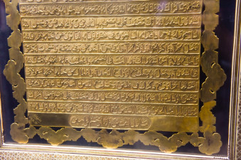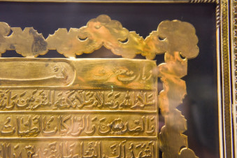 تتوسط القطعة كتابة بارزة منقوشة على النحاس تحمل الزيارة المعروفة لساقي عطاشى كربلاء و التي تبدأ بـ ( سلام الله وسلام ملائكته المقربين ) ، وقد تم طلاء حروفها بالذهب الخالص في لوحة تفيض بهاءً وهيبة إذ زينت بإطارٌ غني بنقوش فن الأرابيسك الذي يعد من أجمل فنون الزخرفة الإسلامية، حيث تتشابك فيها الأشكال الهندسية والنباتية بانسيابية تأسر العين ، يعد الأرابيسك تجسيدًا للفن الإسلامي الذي يمزج بين الهندسة والدين، ويعتبر هو خاتم الفنون إذ يشكل الأرابيسك إطارًا يحمي نص الزيارة معززًا بهاءها وجلالها ومضيفًا بعدًا جمالياً يعكس عمق التأمل والوفاء الذي تحمله كلمات الزيارة في هذه الأيام المباركة، ومع أيام عاشوراء، تستحضر هذه القطعة بوقفتها الثابتة معنى التضحية والوفاء، وتعيد إلى الأذهان صورة ساقي العطاشى وهو يقترب إلى الفرات بقلبٍ ملؤه الإيثار، رافضًا أن يشرب قبل أخيه الحسين عليه السلام هي وثيقة خالدة تترجم شعور الملايين ممن يقصدون كربلاء المقدسة ليجددوا عهدهم مع المولى أبي الفضل العباس عليه السلام في كل موسم حزن.