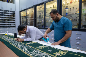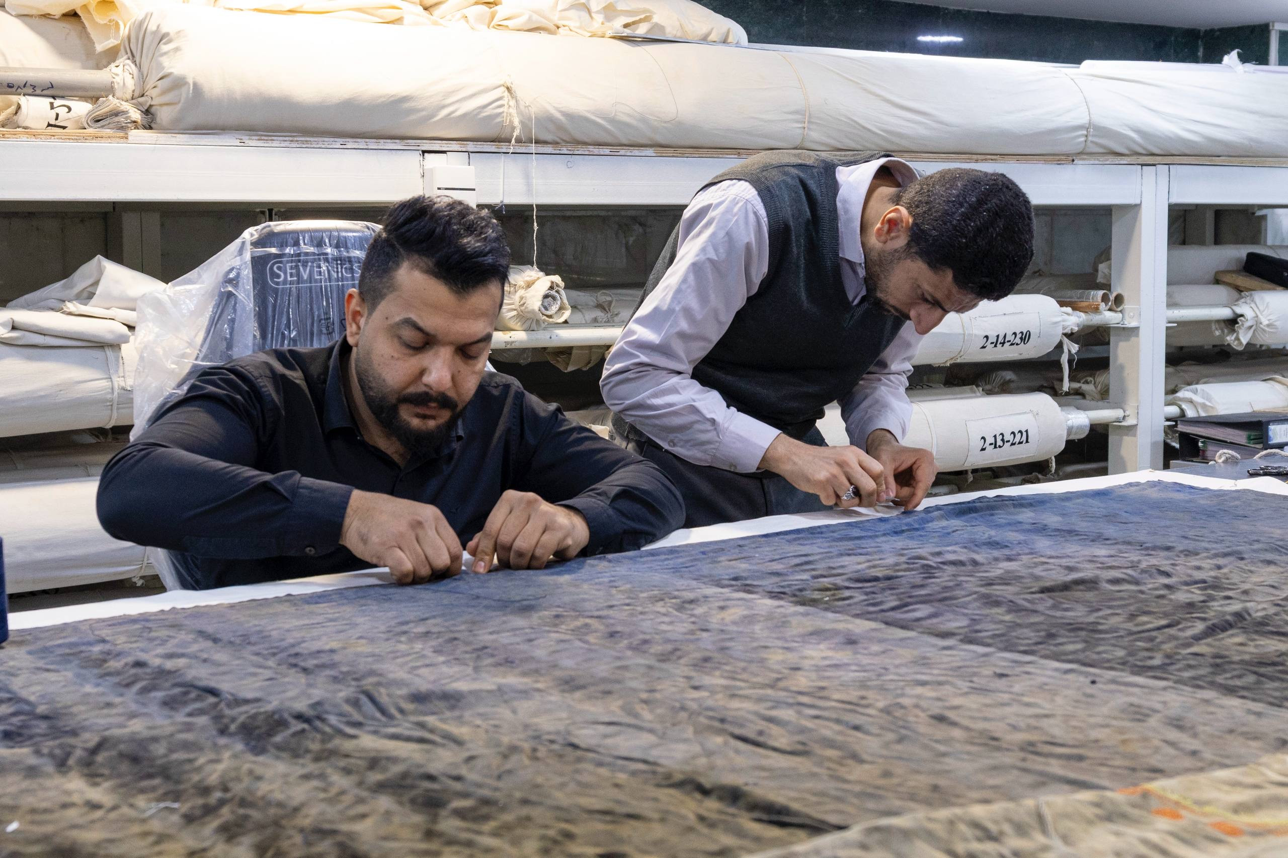 من جانبه ذكر مسؤول وحدة السجاد السيد علي أحمد اعطيه، أنّ "الأعمال بدأت بتنظيف القطع بعناية ثم تدعيمها بقماش الكتان الطبيعي، إلى جانب ترميم الأضرار الناتجة عن التقادم والعوامل البيئية وبما يراعي طبيعة كل قطعة ونوعها النسيجي وخصائصها".