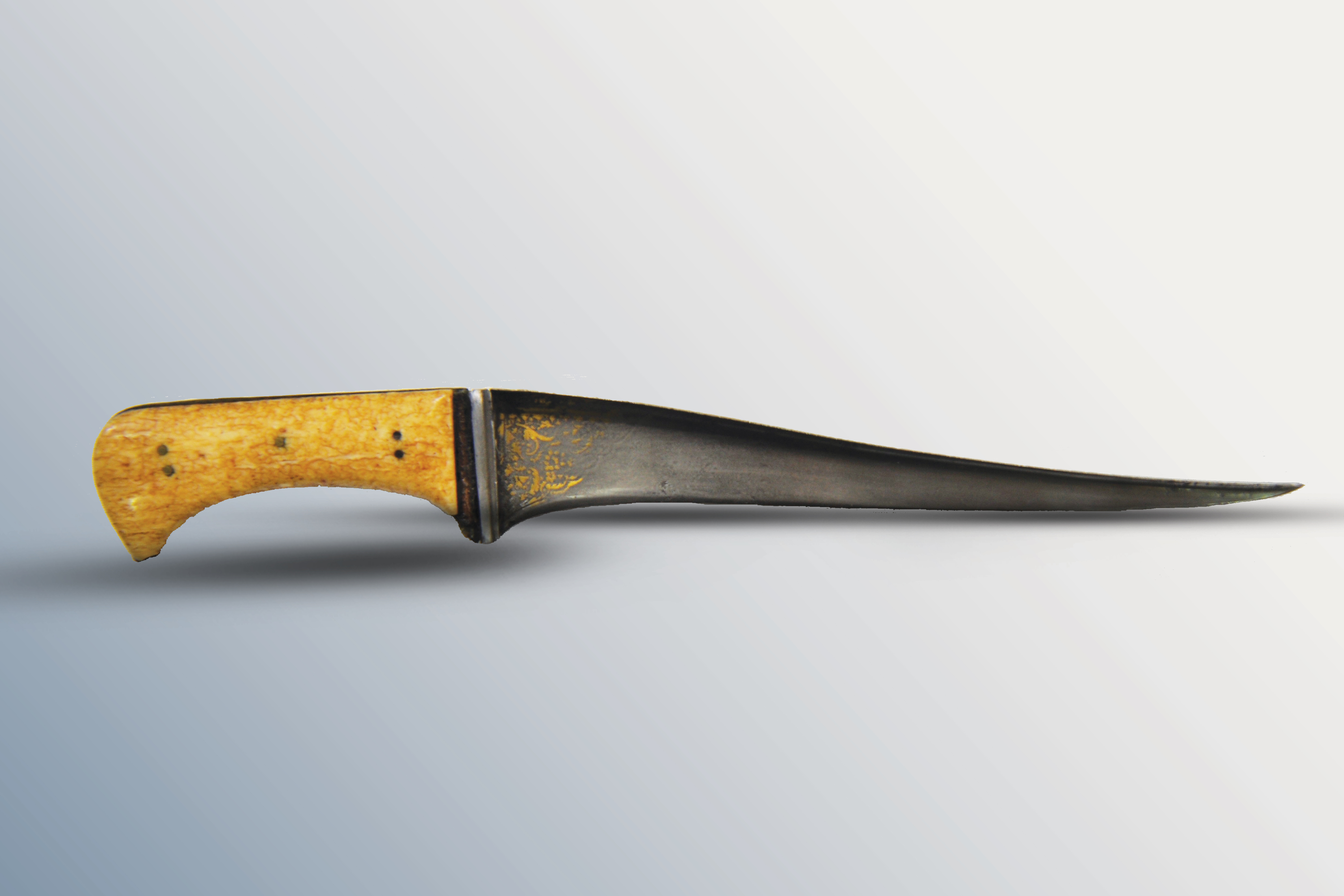 نصل السكين من سبيكة الجوهر الصلب عليه نقوش نباتيه مذهبه من الجهتين اما القبضة فهي من العاج واسفل العاج توجد صفيحتين من النحاس