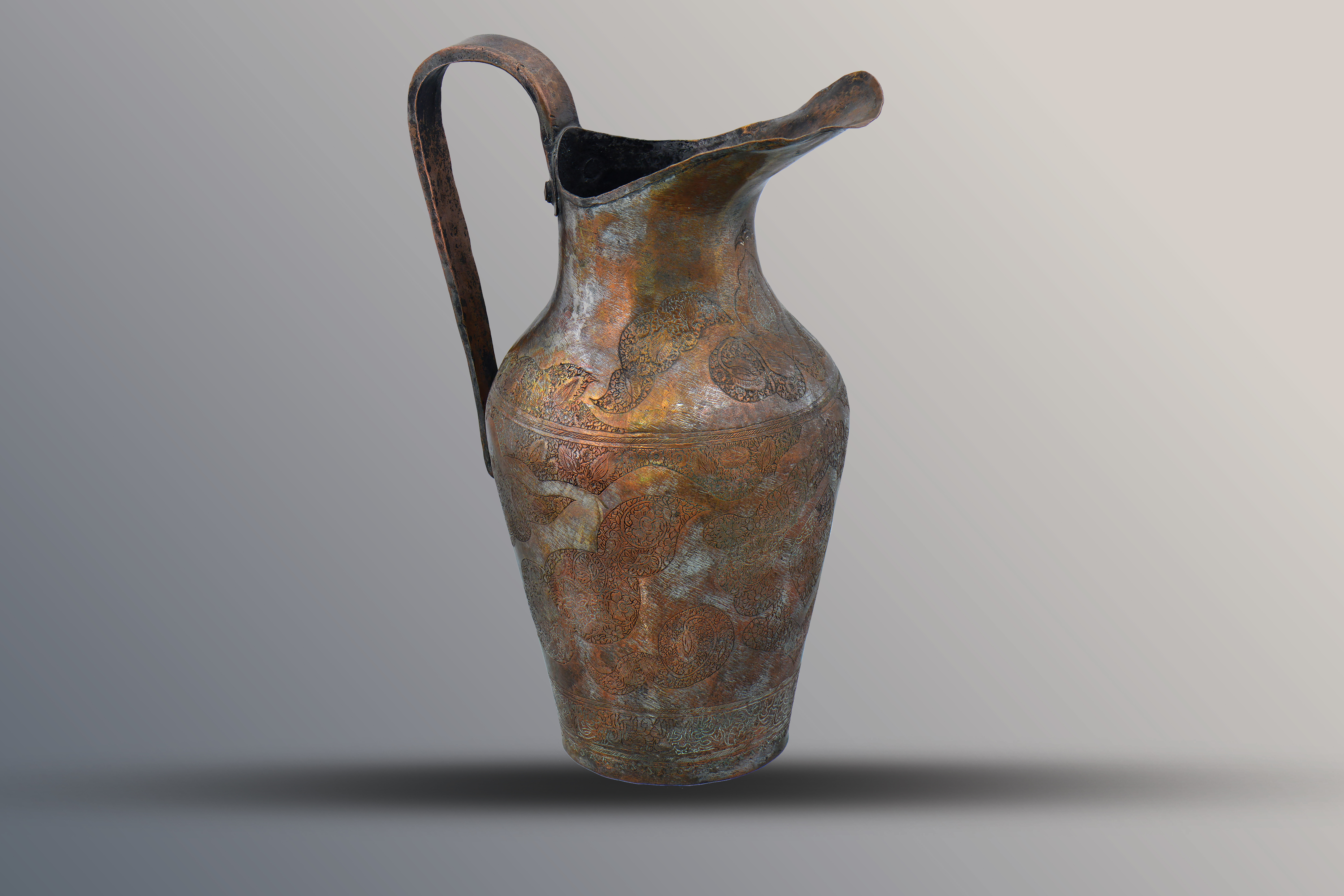 إبريق مصنوع من النحاس الأحمر مطلي بالقصدير توجد عليه زخارف هندسية و نباتية