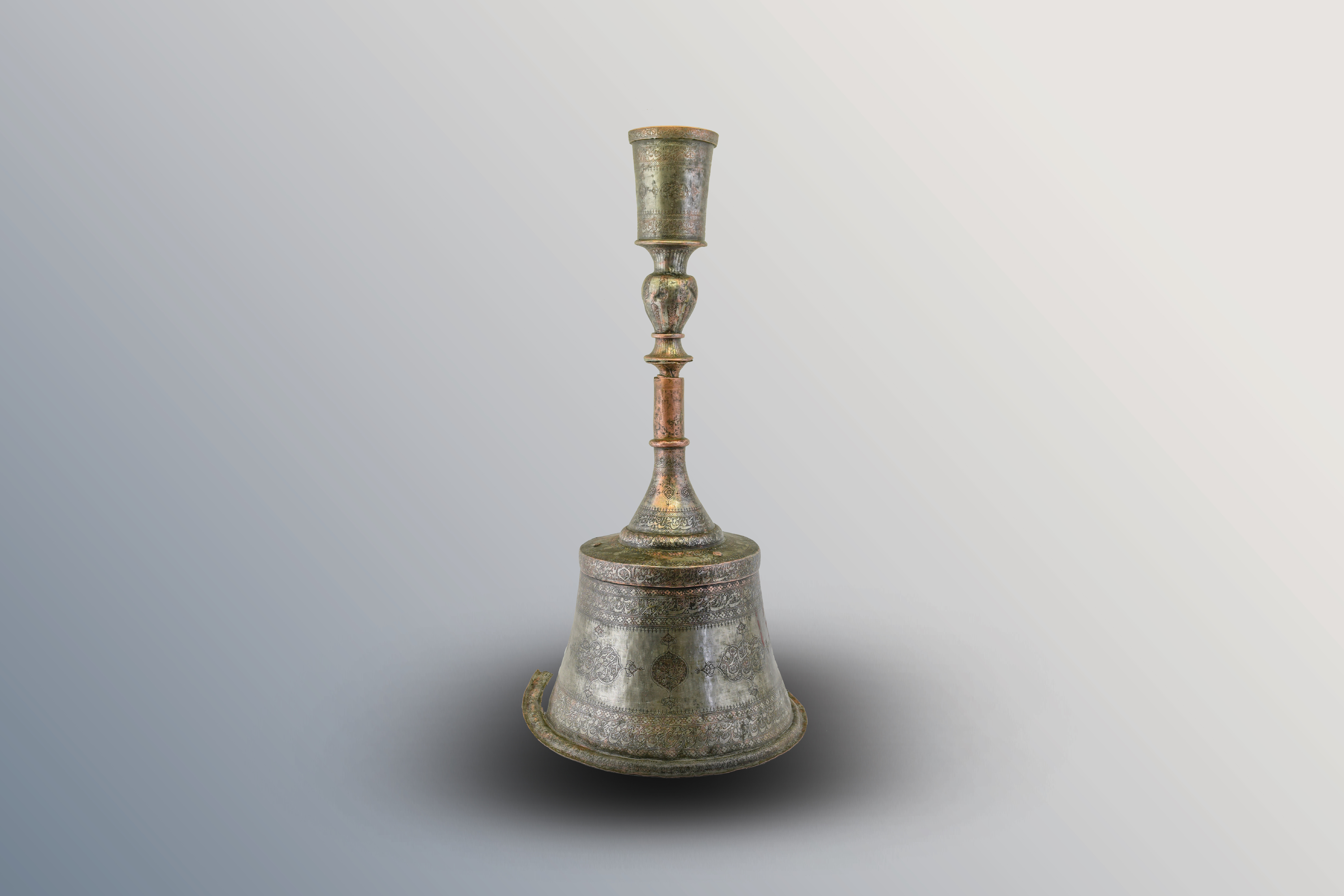 تحفية ( شمعدان ) مصنوع من النحاس الاحمر مطلي بالقصدير يتكون من عدة اجزاء القاعدة دائرية ومجوفة من الاسفل وحافتها متضررة وزينت قرب الحافة بشريط من الزخارف النباتية واما البدن زين بسبعة اشرطة الشريط الاول من الاسفل توجد عليه زخارف نباتية يعلوه الشريط الثاني وتوجد عليه عناصر كتابية باللغة الفارسية قوامها الصلاة والسلام على الأربعة عشر معصوم ( اللهم صل على المصطفى والمرتضى وعلى فاطمة والحسن والحسين وعلي بن الحسين ومحمد بن علي وعلي بن محمد والحسن العسكري ومحمد القائم صلوات الله عليهم اجمعين واللعنة على اعدائهم وغاصبي حقوقهم الى يوم الدين وسنة 1272) يعلوه شريط ثالث عليه زخارف نباتية وفي منتصف البدن شريط رابع يوجد عليه زخارف نباتية متباعدة على محيطه عددها ثمانية زخارف أربعة منها بداخلها عناصر حيوانية قوامها مجموعة ارانب والاربعة الثانية توجد بداخلها عناصر كتابية باللغة الفارسية قوامها على الأرجح شعر فارسي يعلوه الشريط الخامس الذي زيّن بزخارف نباتية ويعلوه الشريط السادس فيه عناصر كتابية باللفة الفارسية قوامها وقفية واسم ( ميرزا محمد كاظم خان ) يعلوه شريط سابع زيّن بزخارف نباتية اما كتف الشمعدان يوجد عليه شريط كتابي باللغة الفارسية قوامه أيضا الصلاة والسلام على الأربعة عشر معصوم وسطح الكتف يوجد عليه زخارف نباتية تتصل به قطعة مخروطية فيها اشرطة زخرفية وعناصر كتابية ونباتية قوامها ( حضرت الخاقان مؤتمن السلطان ميرزا محمد صادق نوري .. ) و قطعة كمثرية زينت بالمرايا و تتصل بحاضن اسطواني فية سبعة اشرطة زخرفية وعناصر كتابية الأول من الأسفل عليه زخارف نباتية يعلوه شريط عليه عناصر كتابية باللغة الفارسية قوامها ى( ايران نظام الملك ميرزا محمد كاظم خان ) يعلوه شريط صغير نباتي واخر فيه زخارف نباتية متباعدة وبداخلها عناصر حيوانية وكتابية قوامها ( عمل محمود 1272 ) يعلوها اشرطة زخرفة وكتابية وكذلك زينت حافة الحاضن أيضا بشريط من الزخارف النباتية .